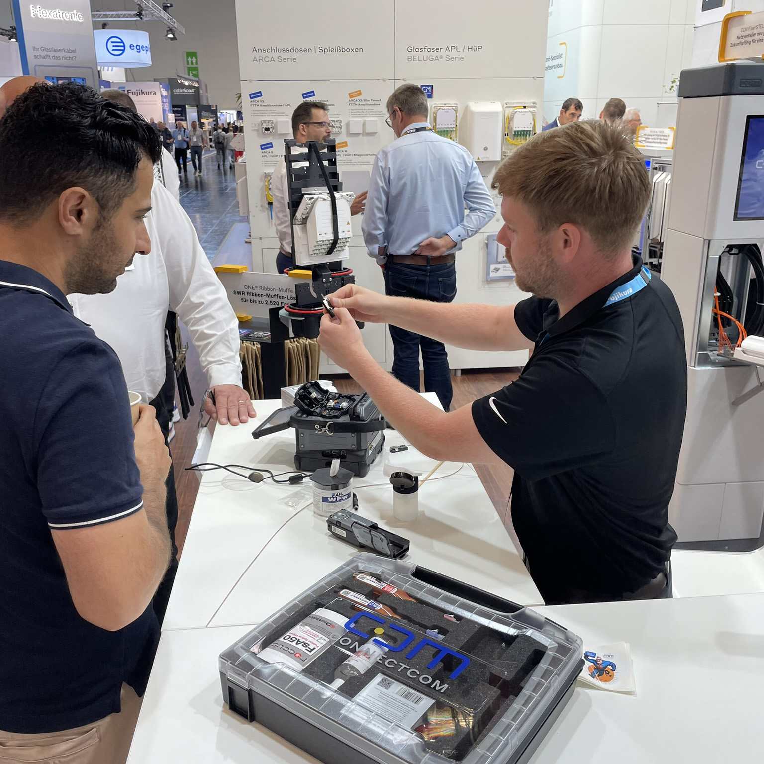 Die patentierte Spider Web Ribbon (SWR®)-Technologie von Fujikura verbindet hohe Faserdichte mit maximaler Flexibilität. Erleben Sie Spleiß-Performance live an der Präsentationstheke und entdecken Sie SWR®-Einsatzszenarien an unseren Musteraufbauten.